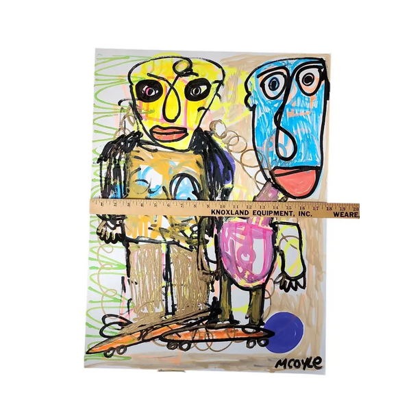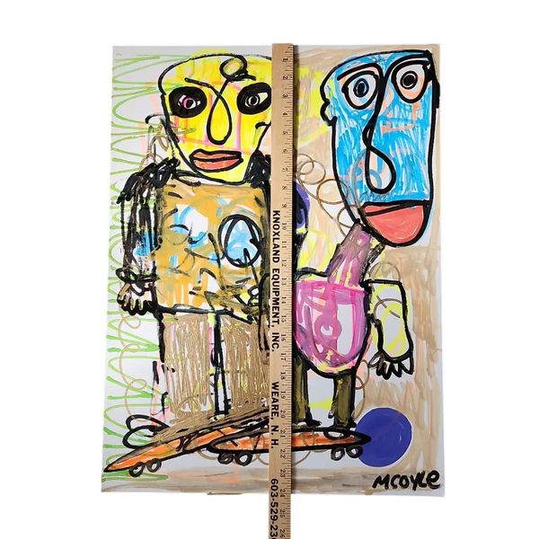 Hombres is an original 18 x 24 inch artwork by outsider artist Martin Coyle. Bold, raw, and expressive, this piece captures two striking figures outlined in thick black lines and filled with a vibrant mix of neon yellows, blues, pinks, and earthy tones. With their oversized features and skateboard-like bases, the characters radiate both playfulness and unease, embodying Coyle’s signature blend of humor and surreal intensity.