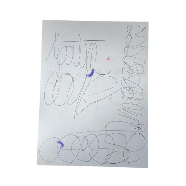 Layered backgrounds of looping scribbles and contrasting colors add energy and movement, making Hombres a dynamic statement piece. Signed by the artist in the lower right corner, this one-of-a-kind work is ideal for collectors who appreciate bold, unconventional art that challenges boundaries while sparking curiosity.