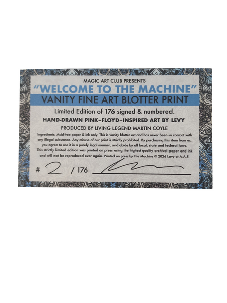 “Welcome to the Machine” is a 2026 signed and numbered limited edition blotter art print by Levy in collaboration with Magic Art Club. Produced on authentic perforated blotter paper, this edition is strictly limited to 176 prints, making it a rare and highly collectible release.